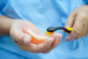 入れ歯は外してから、専用の入れ歯ブラシや柔らかめの歯ブラシで清掃します。