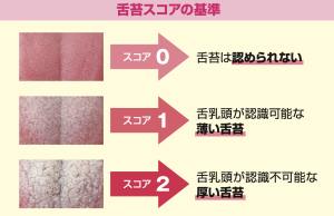 以下の『舌苔スコア』は、口腔機能低下症の検査の一つで使用します。口腔機能低下症検査で舌苔の状態を確認してお知らせしています。