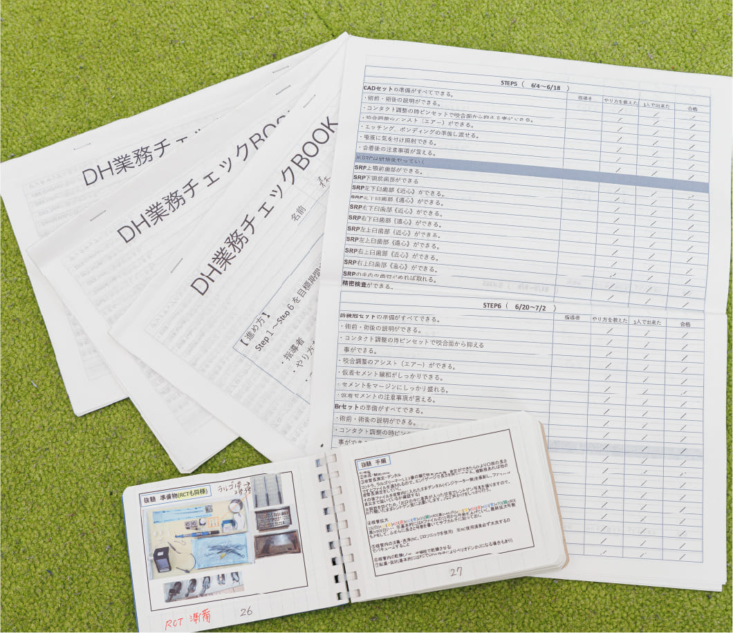 当院では、段階を踏んで成長できるように、歯科衛生士の教育カリキュラムを用意しています。「いきなりわからない仕事を任される」「教えてもらえない」「自己流だから、できているかよくわからない」といった状況にならず、カリキュラムに沿って、基礎を確実に学び、段階を踏んで確実に仕事を覚えることができるので、将来の成長にもつながります。